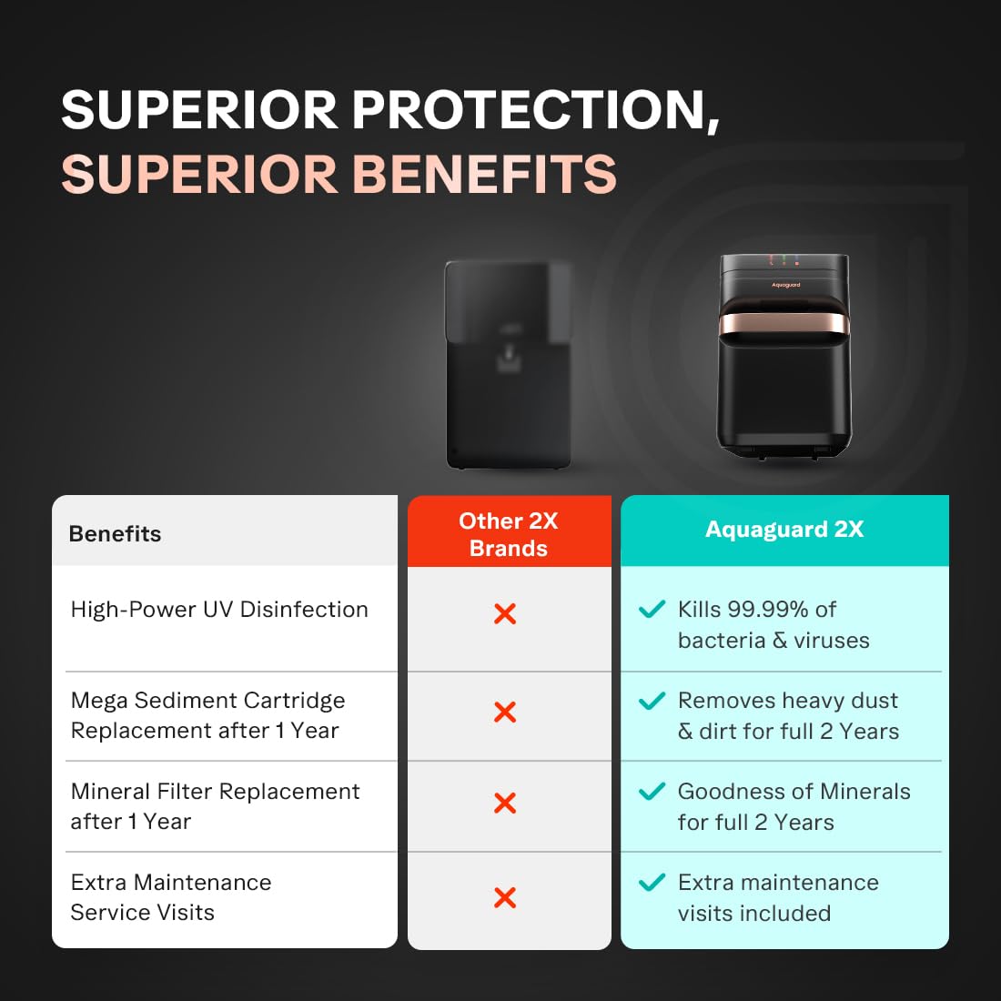 - Save over ₹14,000 on filter replacements with Aquaguard with 2 Year Filter Life as compared to other brands – fewer replacements, more savings!