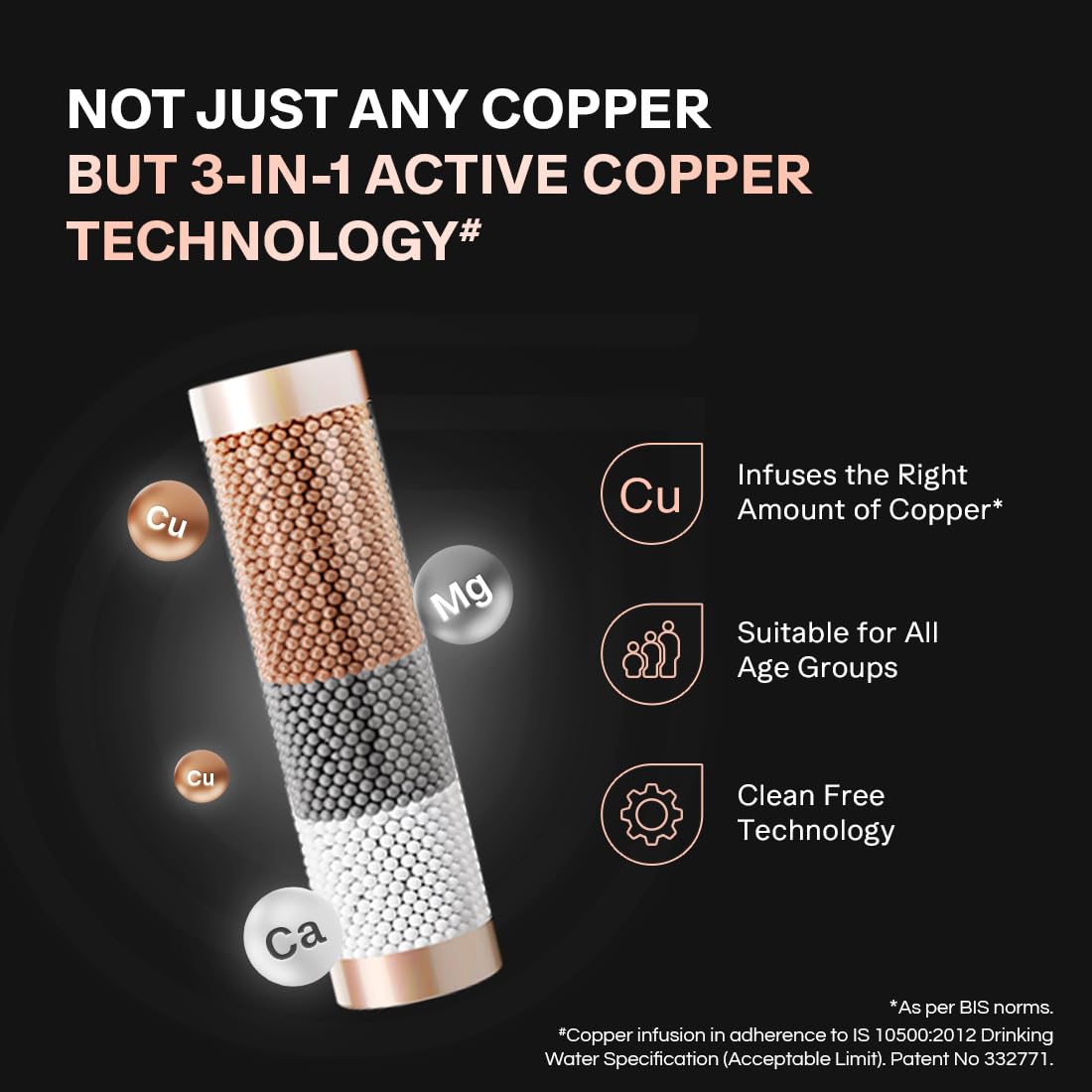 - 3-in-1 Patented Active Copper Technology - Infuses the right amount of copper from the first drop (As per BIS norms). Comes with clean free technology and is suitable for all age groups