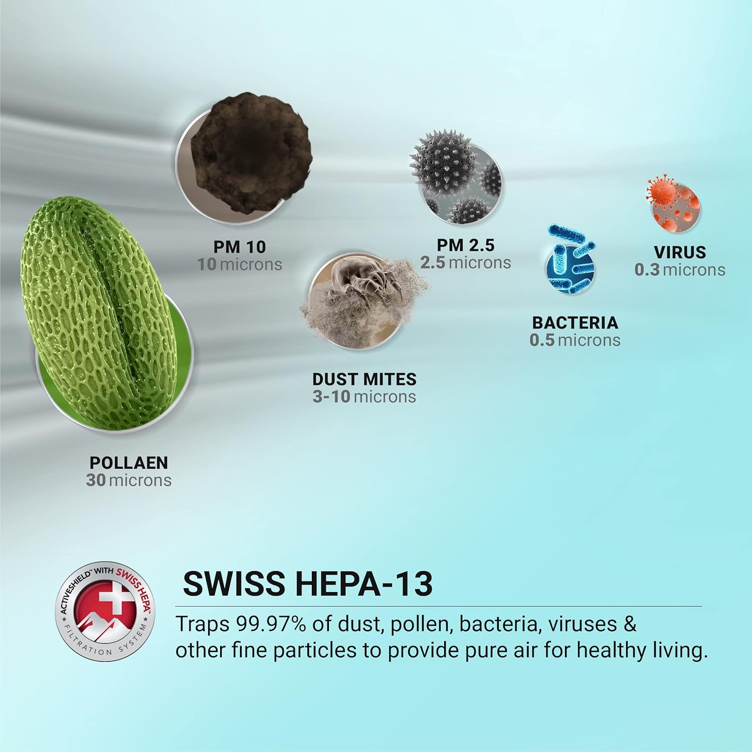 - Comes with the help of Professional HEPA 13, removing upto 99.97 % micro-particles such as PM 2.5 and 10 (fine dust, pollen and mould spores)